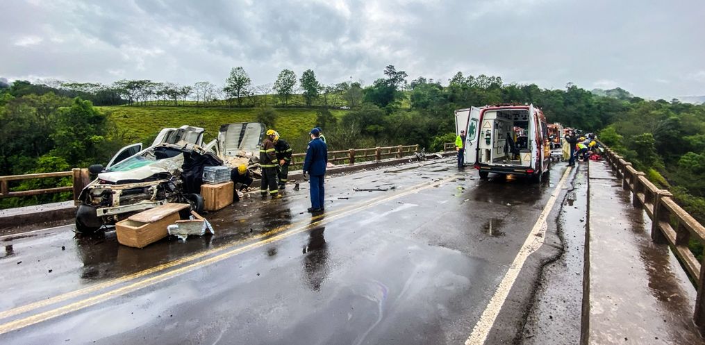 No local, foi confirmado uma colisão envolvendo uma Fiorino com placas de Palma Sola, um Iveco emplacado em Videira e ainda uma Tracker com placas de Flor do Sertão. Sobre a ponte encontrava-se então o veículo Fiorino, com uma vítima, de 50 anos, em óbito no local, politraumatizada e encarcerado. Também o veículo furgão, com três ocupantes: o condutor de 28 anos, com mais ferimentos, ele foi imobilizado e encaminhado ao Hospital de Maravilha pela equipe do SAMU. Uma mulher de 27 anos, que também estava no furgão, foi atendida com ferimentos generalizados e levada ao mesmo hospital pelos bombeiros de Maravilha, bem como uma criança de 4 anos com lesões leves.