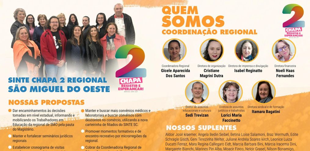 Dessa forma, a nova coordenadora regional do Sinte é a professora Gicele dos Santos de Barra Bonita e no estado o novo coordenador é o professor Evandro Accadrolli de Chapecó.