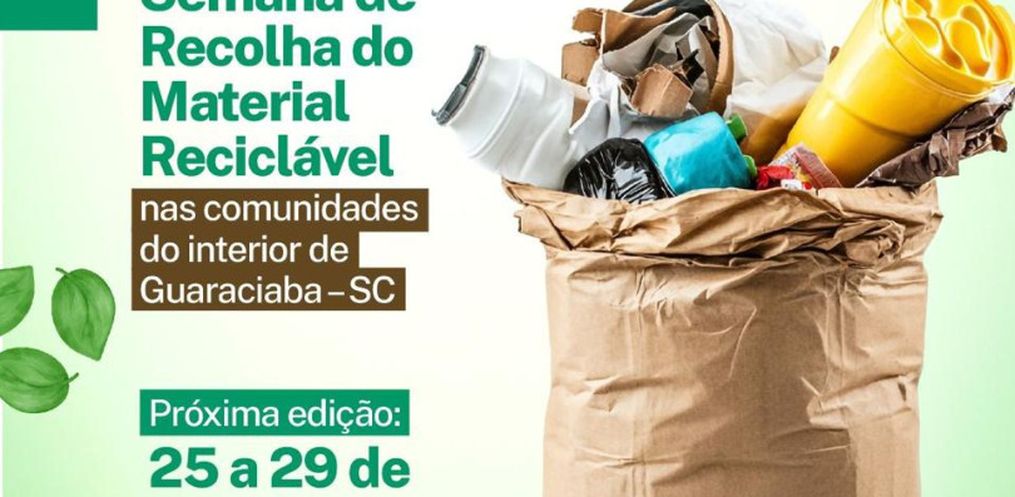 A Prefeitura de Guaraciaba, por meio da Secretaria de Agricultura e Meio Ambiente, realiza na próxima semana uma nova rodada de recolhimento de materiais recicláveis nas comunidades do interior do município. A coleta será feita entre os dias 25 e 29 de agosto, com roteiro já definido.