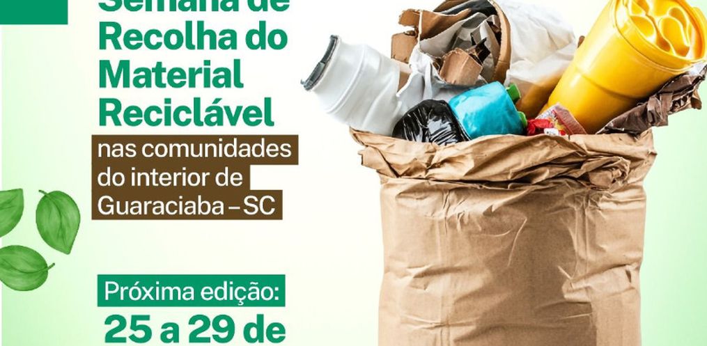 A Administração Municipal de Guaraciaba através da Secretaria de Agricultura e Meio Ambiente comunica que realizará mais um cronograma de recolha de materiais recicláveis nas comunidades do interior do Município. O roteiro será realizado do dia 25 ao dia 29 de agosto.