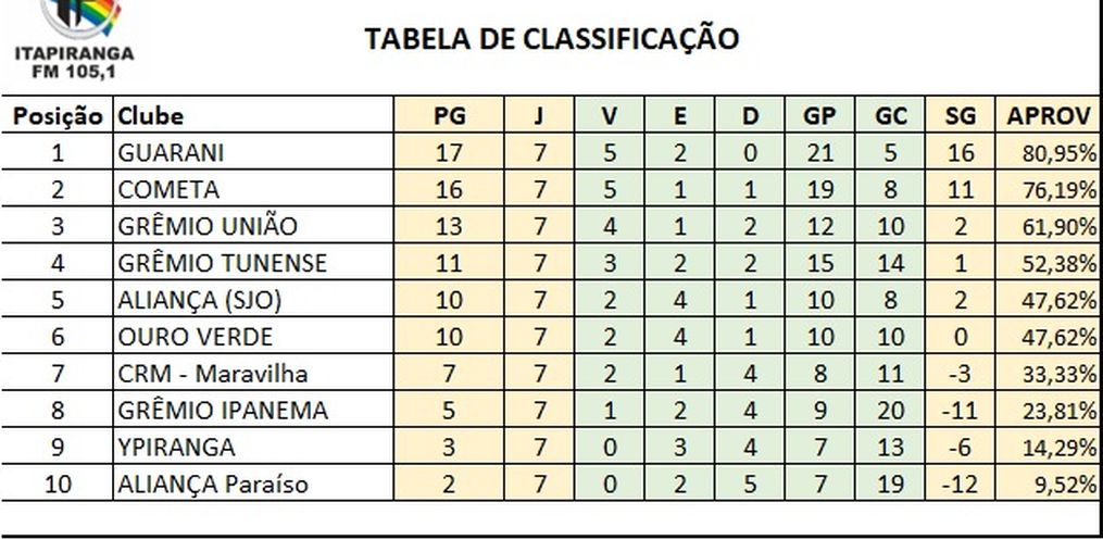 Com a vitória, o Guarani chega a cinco triunfos em sete jogos, mantendo-se no topo da tabela, seguido de perto pelo E.C. Cometa, que tem 16 pontos. Já o Ipanema segue na parte de baixo, com apenas 5 pontos, e precisa reagir nas próximas rodadas para fugir da zona de perigo.