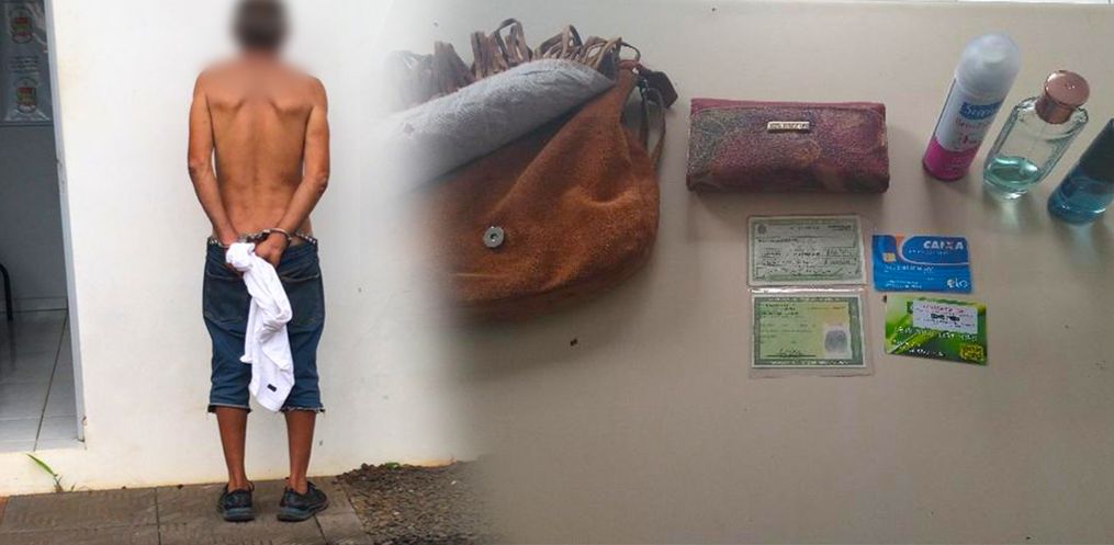 A guarnição fez o trabalho de busca pessoal e questionado o homem referente a um furto de uma bolsa, fato que havia acontecido recentemente, o mesmo informou ser o autor e repassou a informação de que a bolsa estava escondida nas proximidades.