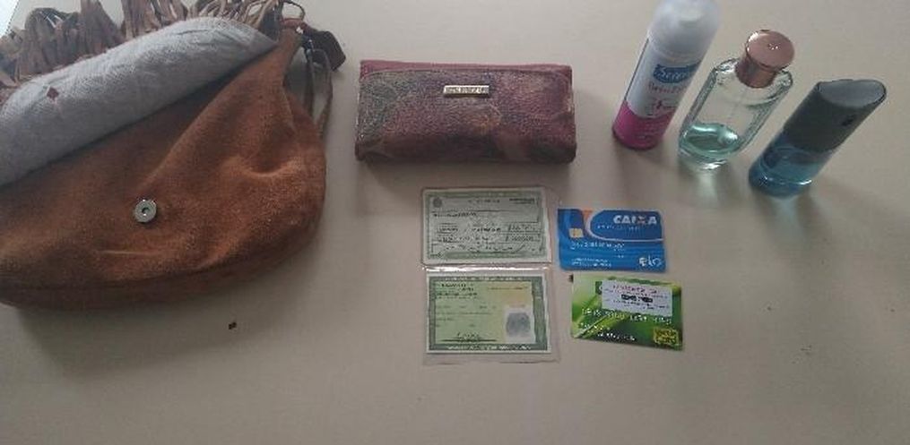 No local indicado pelo homem, foi localizada uma bolsa, escondida em meio a alguns galhos, que estava revirada e com pertences da vítima jogados fora da bolsa.
