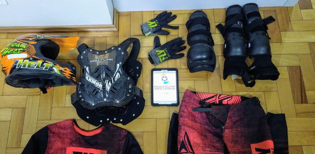Foi efetuado a abordagem, e o homem estava de posse dos objetos furtados, um capacete, roupa de motocross (que o mesmo estava usando), joelheiras, cotoveleiras, luvas e colete.