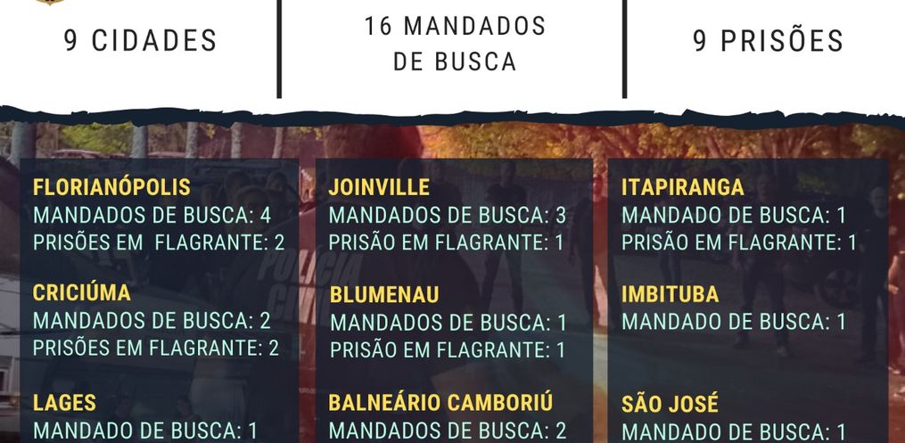 A Polícia Civil de Santa Catarina realiza, nesta terça-feira, a Operação Luz na Infância 6. A força-tarefa nacional é coordenada pelo Ministério da Justiça e Segurança Pública e envolve polícias civis de 12 Estados.