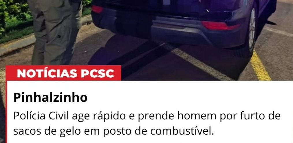 Na tarde desta terça-feira, 23, a Polícia Civil de Pinhalzinho agiu rapidamente e prendeu em flagrante um homem, de 25 anos, pelo furto de 12 sacos de gelo em um posto de gasolina da cidade.