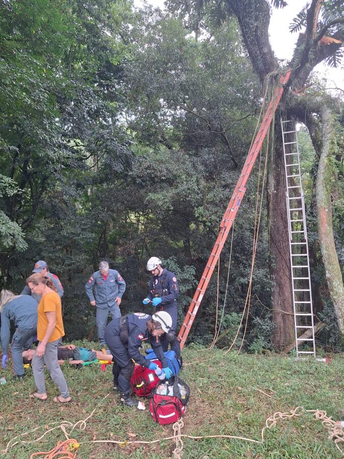 Segundo o Corpo de Bombeiros, as equipes usaram uma ferramenta hidráulica para afastar o galho e aliviar a pressão sobre a perna. A aeronave do SAER de Chapecó foi acionado e prestou atendimento ao homem, devido ao risco de complicações, como a síndrome do esmagamento. A suspeita de fratura no tornozelo direito e um ferimento no pé.