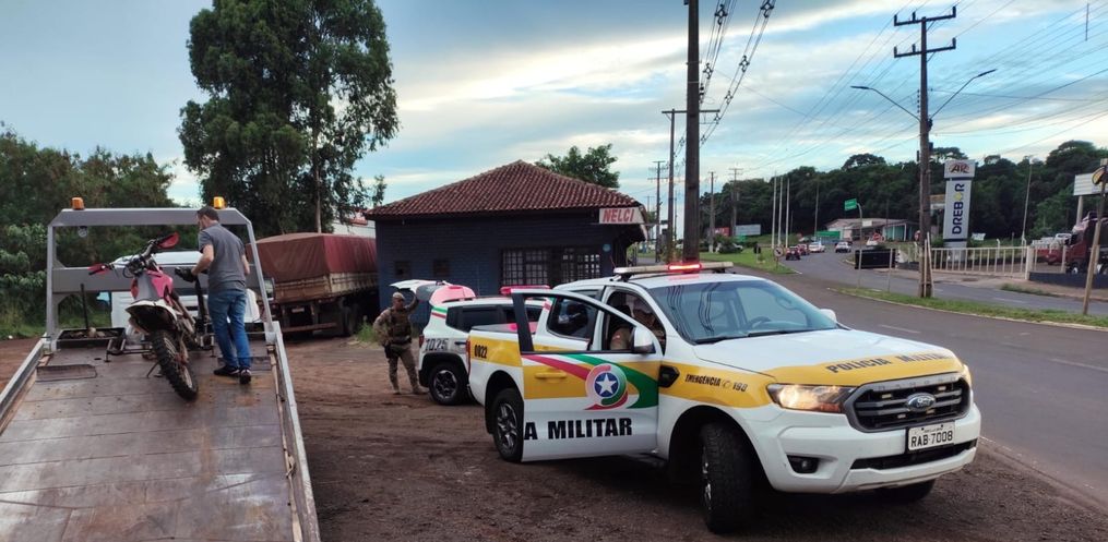 A viatura em patrulhamento avistou a moto sem placa e tentou a abordagem. O condutor tentou fugir, mas foi detido pelos policiais nas proximidades do trevo de São Miguel do Oeste.