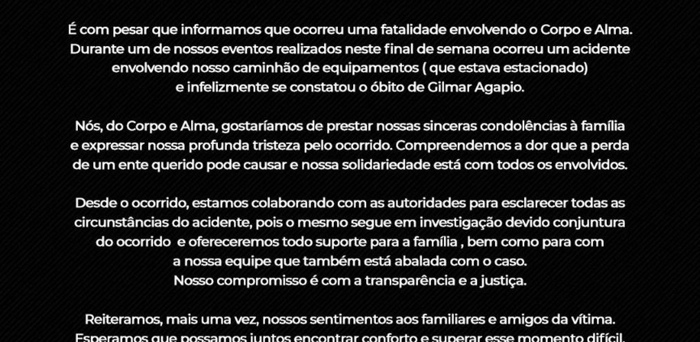 É com pesar que informamos que ocorreu uma fatalidade envolvendo o Corpo e Alma. Durante um de nossos eventos realizados neste final de semana ocorreu um acidente envolvendo nosso caminhão de equipamentos (que estava estacionado) e infelizmente se constatou o óbito de Gilmar Agapio.