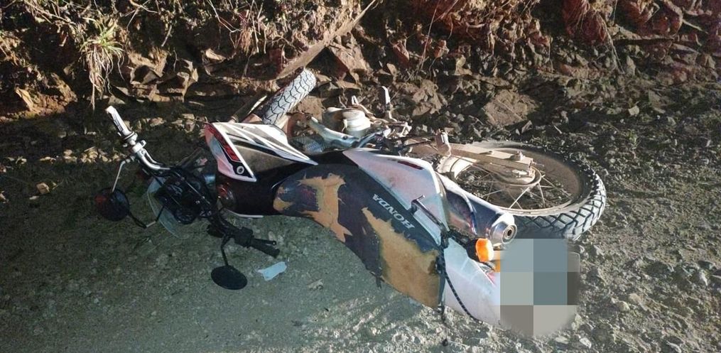 Ao chegar ao local, a guarnição encontrou o Corpo de Bombeiros já em atendimento, porém o condutor já estava sem vida. A motocicleta foi localizada caída em uma valeta próxima ao ponto do acidente, com marcas compatíveis com queda e com o pneu dianteiro furado, sem indícios de colisão com barrancos ou outros obstáculos.