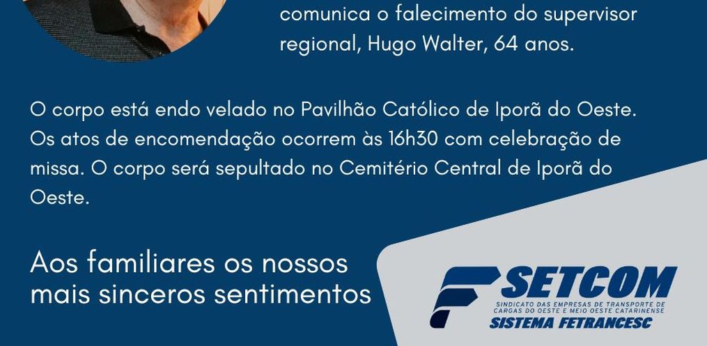 O supervisor regional do SETCOM – Sindicato das Empresas de Transporte de Cargas do Oeste e Meio Oeste Catarinense, Hugo Walter, morreu na madrugada desta quinta-feira, 24, aos 64 anos, no Hospital de Iporã do Oeste. Walter tomou posse como supervisor regional do SETCOM no dia 22 de junho de 2006. Através de sua iniciativa e com apoio de alguns transportadores, foi fundada a Cooper Fronteira Sul, em outubro de 2014.