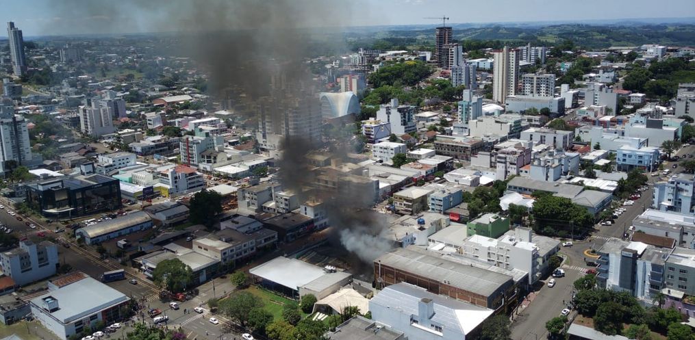Na Rua Almirante Tamandaré, a população ainda se reúne para acompanhar os rescaldos do incêndio de grandes proporções no Super Vipi Center, no início da tarde desta quinta-feira, 24, em São Miguel do Oeste. Aestrutura do comércio ficou comprometida pelo fogo. Embora as portas estejam fechadas, pelos vidros quebrados é possível ver a gravidade da ocorrência. Imagens áreas também mostram a destruição.