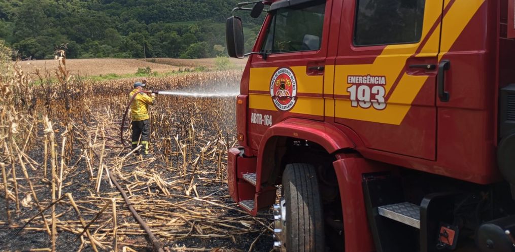 Um incêndio atingiu uma lavoura de milho por volta das 13h25 deste sábado, 31, na comunidade de Linha Ibiaçá, no interior do município de Serra Alta.