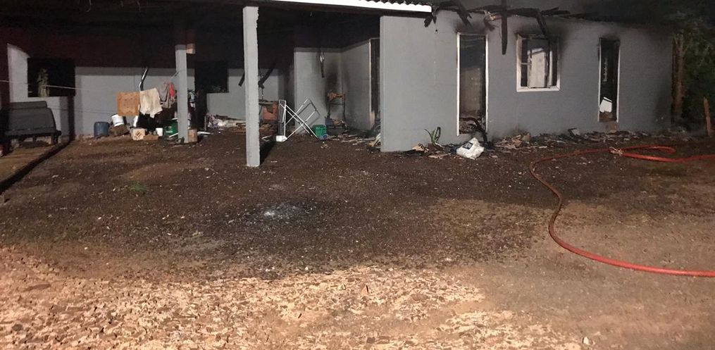 Chegando ao local foi confirmada a ocorrência em uma residência unifamiliar de um pavimento de aproximadamente 85m² de alvenaria, totalmente consumidas pelas chamas.