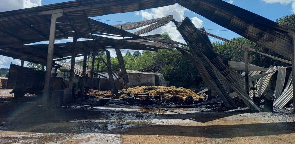 Conforme as informações, no interior do galpão havia um carretão agrícola, um distribuidor de esterco, três toneis de diesel de 200 litros cada, oito tambores de óleo motor, um cilindro de oxigênio de 50 litros, um cilindro de argônio, duas P-13, uma plataforma automotriz, diversos equipamentos agrícolas e 300 fardos de feno.