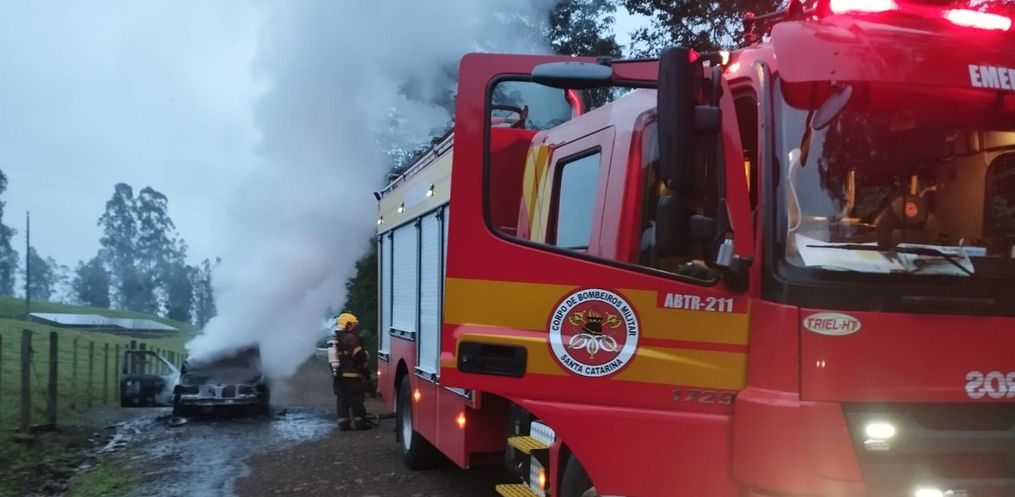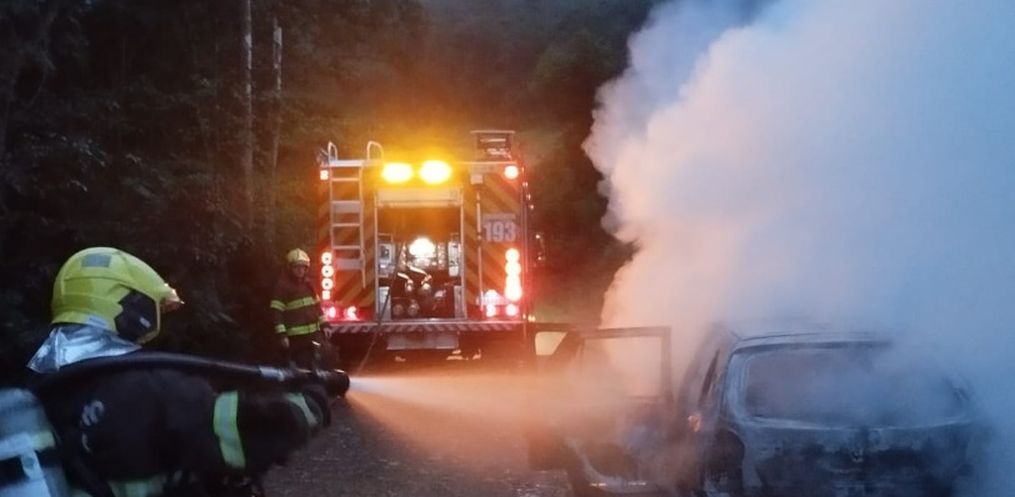 Um carro foi completamente destruído por um incêndio na manhã desta segunda-feira, 19, por volta das 06h15, na Linha Explendor, interior do município de Iraceminha.