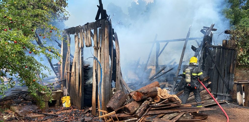 Na manhã desta sexta-feira (28), por volta das 10h30, um incêndio destruiu completamente um galpão em uma propriedade próxima ao CTG Candeiro do Oeste, em Descanso.