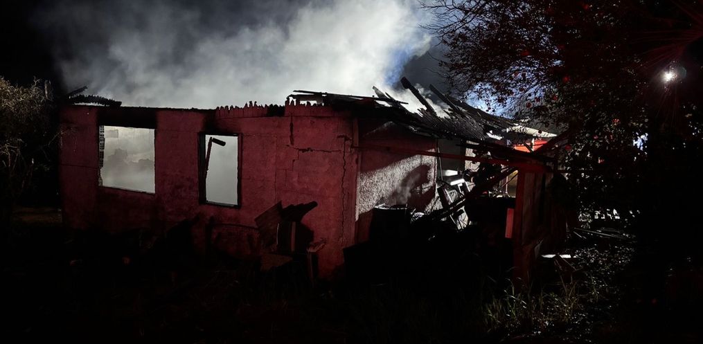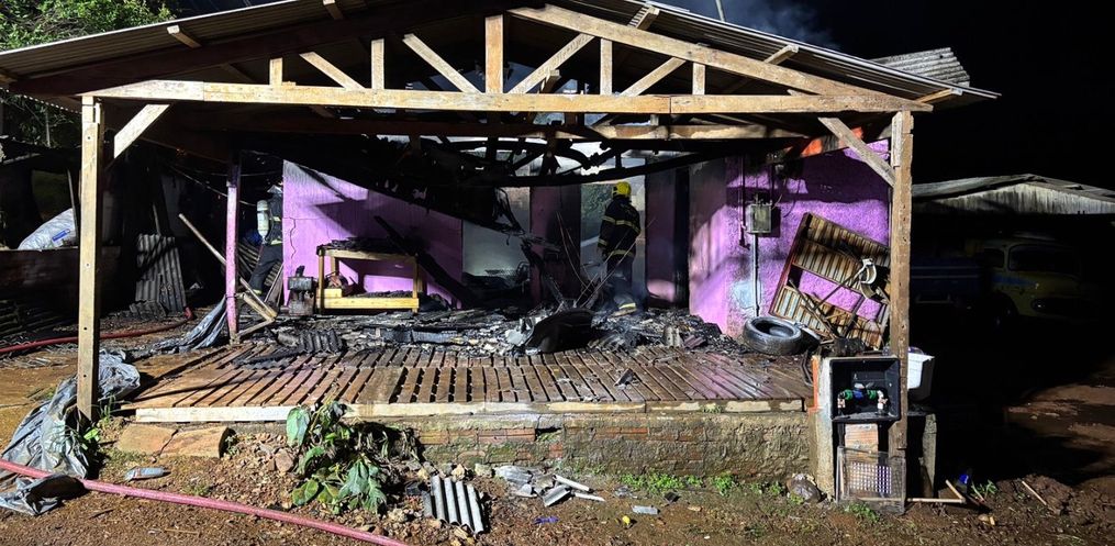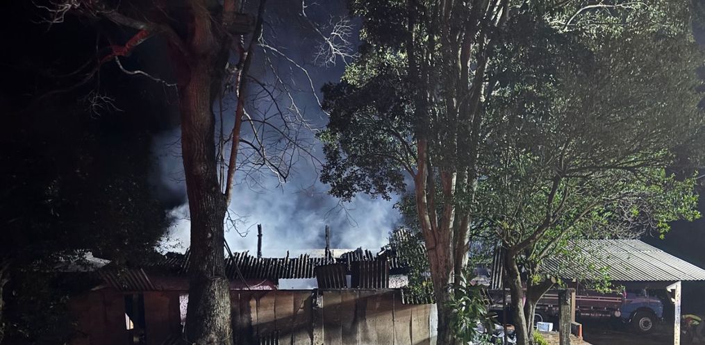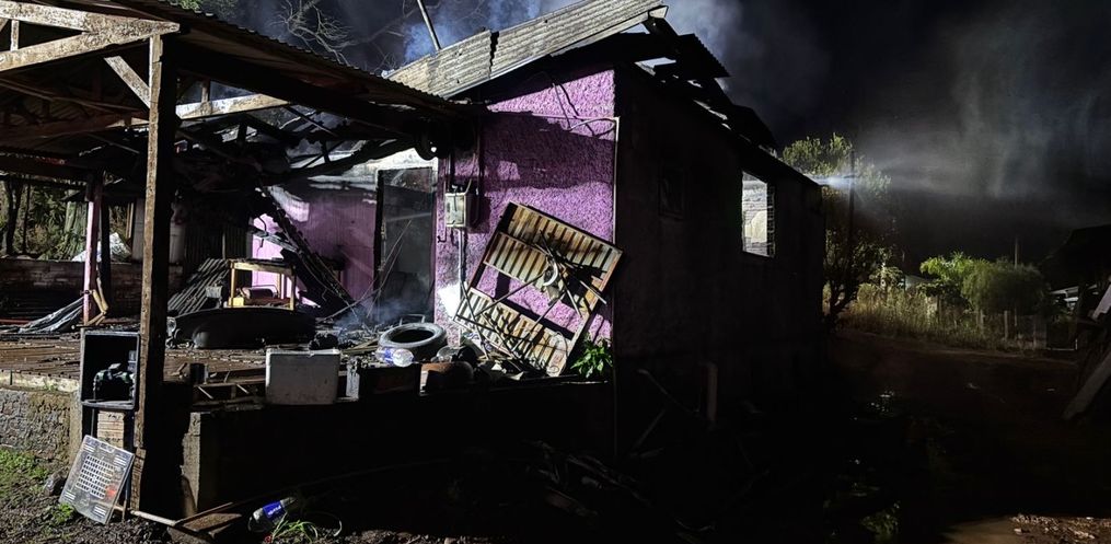 Um incêndio destruiu um imóvel que abrigava uma borracharia e uma mecânica por volta das 23h30 desta sexta-feira, 16, na Linha Campinas, no município de Descanso.