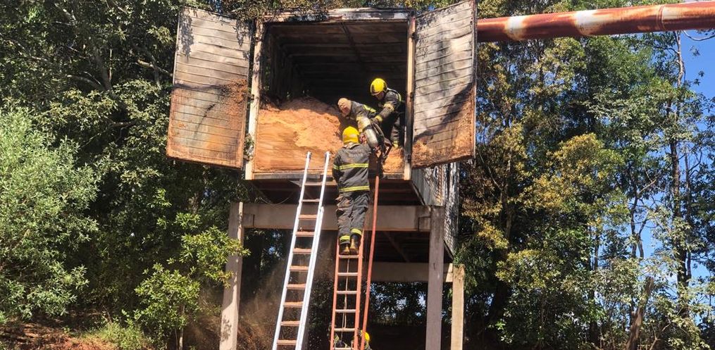 Ao chegar no local a guarnição deparou-se com princípio de incêndio em depósito de maravalha, um container suspenso, a cerca de 5m de altura.