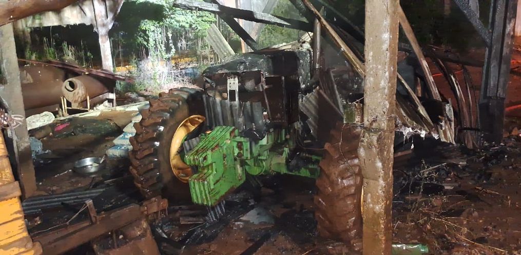 Um trator pegou fogo na madrugada desta quarta-feira, 29, na Linha Três Pinheiros, em Palmitos. As chamas se alastraram e atingiram parte de um galpão agropecuário antes de serem contidas.