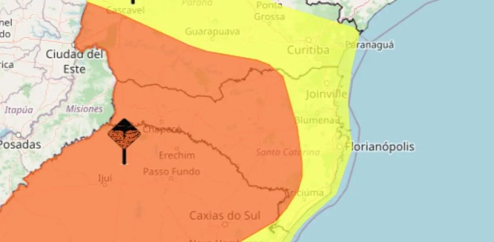 O aviso é válido para as regiões Oeste, Serra, Norte, Sul, Vale do Itajaí e Grande Florianópolis. Áreas do Paraná e do Rio Grande do Sul também estão em alerta laranja.