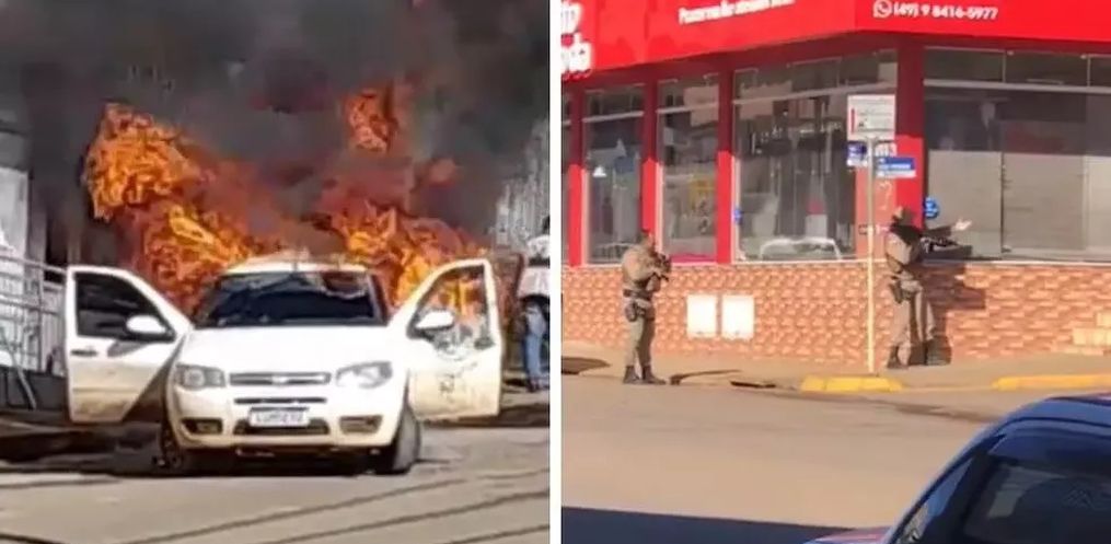 Em imagens compartilhadas nas redes sociais, e confirmadas pela Polícia Militar, é possível ver um carro pegando fogo na frente da unidade bancária enquanto tiros são disparados nas proximidades.
