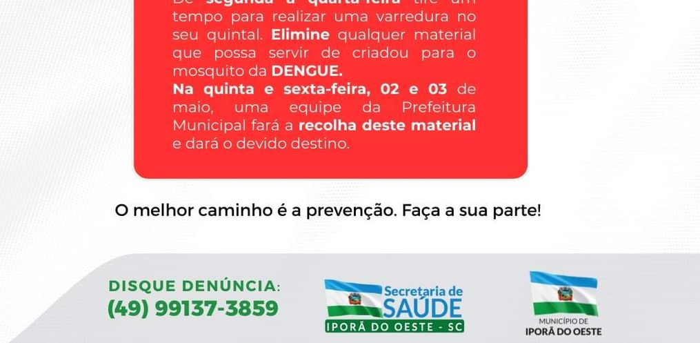 A Fiscal Sanitária da Secretaria de Saúde e Assistência Social pede a colaboração da população, para que evitem deixar materiais e lixos jogados à céu aberto, e façam a correta vedação das caixas de água e demais reservatórios, e a limpeza frequente das calhas nas residências. Simone Morreti lembra que a Secretária de Saúde de Iporã do Oeste possui à disposição da população, telas para vedação de caixas d’água, e está adquirindo pedras de cloro para o tratamento correto da água.