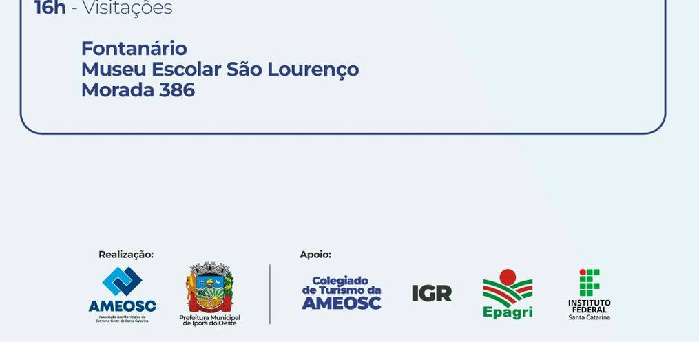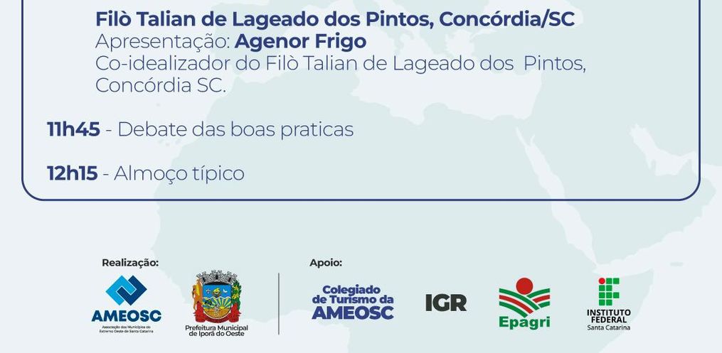 Já na parte da tarde, serão mais três cases: o do Sítio Retorno de Iporã do Oeste, o Turismo de experiência na fruticultura de Arroio Trinta e o Chalé Monte Maria de Iporã do Oeste. No final da tarde, os participantes do seminário também vão participar de uma visita orientada em três pontos turísticos de Iporã do Oeste: o Fontanário, o Museu Escolar São Lourenço e a Morada 386. Airton Fontana enalteceu que cerca de 200 pessoas são esperadas para o Seminário.