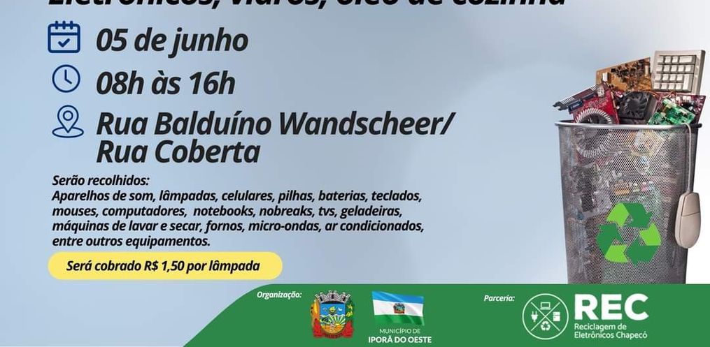 O município de Iporã do Oeste vai realizar nesta quarta feira, 05, mais uma campanha de coleta de materiais eletrônicos, vidros e óleo de cozinha. Conforme o Secretário de Administração e Finanças Ervino Henkel, o local de recolha dos materiais em desuso será na Rua Coberta, em frente ao CAESP/APAE Caminho de Luz, no período da 08h às 16h, sem interrupção ao meio dia.