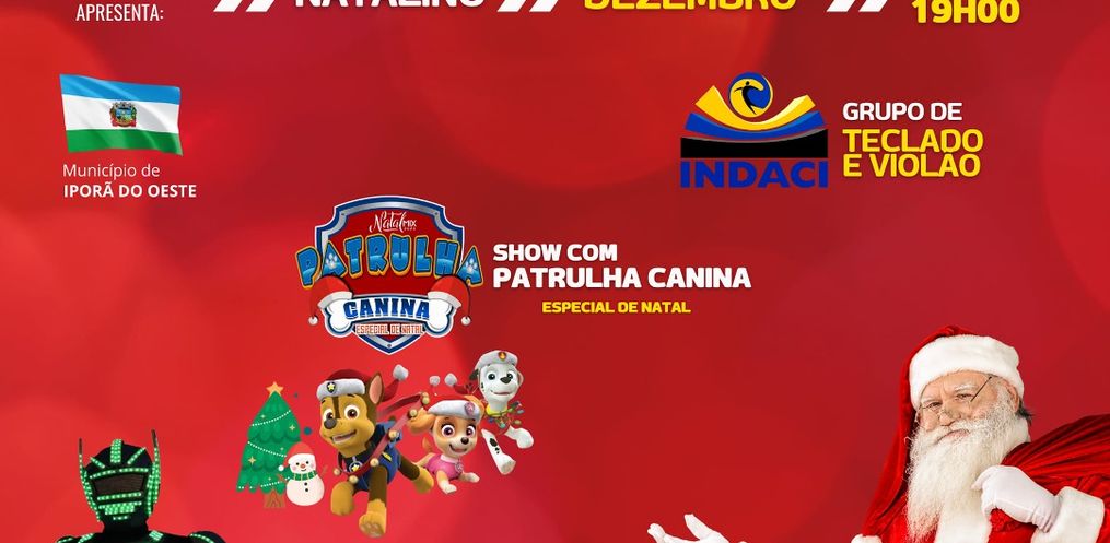 A programação do Iporã Natal Show 2023 terá continuidade na noite desta sexta-feira, 22, em Iporã do Oeste. A partir das 19h, na Rua Coberta, terá o momento mais aguardado da programação, com show natalino das oficinas de teclado e violão do INDACI, chegada do papai-noel, show natalino com a caravana Natal Mix e ainda show infantil com a Patrulha Canina.