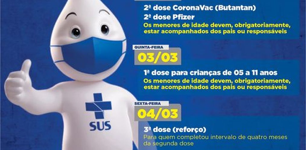 - Quinta-feira, 03/03 -1ª dose para crianças de 5 a 11 anos. Devem obrigatoriamente estar acompanhados dos pais ou responsáveis.