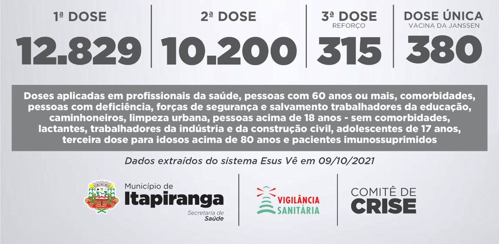 São 10.200 pessoas que já receberam duas doses da vacina contra o Coronavírus. 380 pessoas receberam a dose única e 315 idosos já tiveram a vacina de reforço.