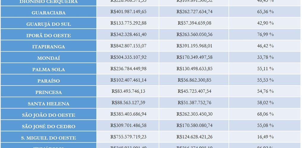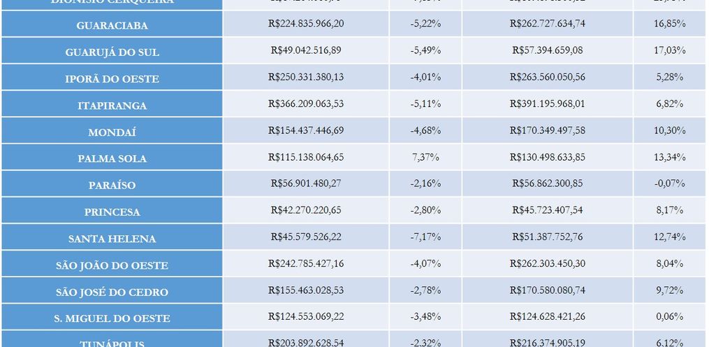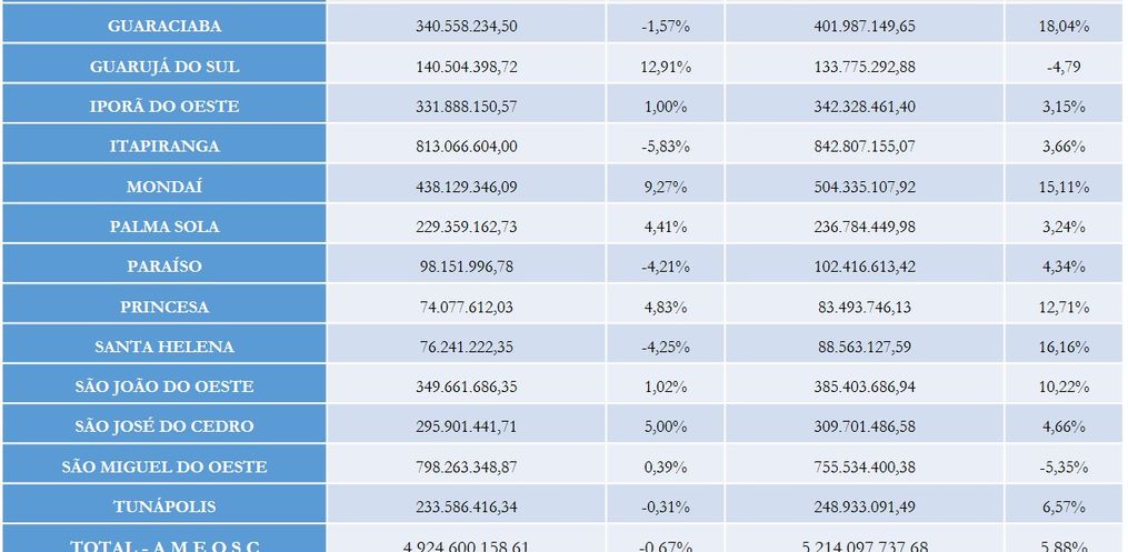 Itapiranga mantém a liderança no movimento econômico dos 19 municípios e registrou crescimento de 3,66%. São João do Oeste foi destaque com acréscimo no movimento econômico de 10,22% e Tunápolis cresceu 6,57%. De acordo com o diretor, o movimento agropecuário tem grande impacto no movimento econômico geral. Tunápolis é destaque com 87%, em São João do Oeste o agropecuário representa 68%. Em Itapiranga 46% do movimento econômico do município vêm do setor agropecuário.