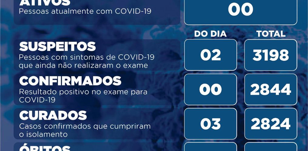 Desde o início da pandemia o município contabilizou 2.844 casos e 20 óbitos em decorrência da doença.