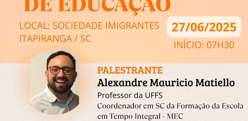 A programação inicia com relatos de ações bem-sucedidas da escola estadual Porto Novo e da Escola Bela Vista da rede municipal de ensino. Na sequência terá homenagem aos professores aposentados e palestra com Alexandre Matiello, professor da Universidade da Universidade Fronteira Sul e coordenador da Escola em Tempo Integral do Ministério da Educação.