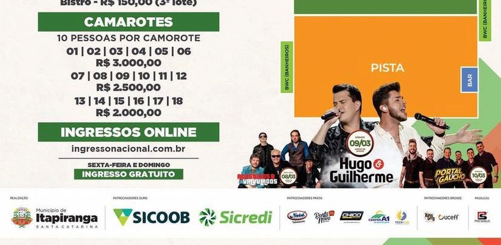 O público possui opções em camarote, bistrô, vip e pista. O coordenador dos shows, Marcos Propodolski, destaca que na sexta-feira, dia 08 de março, terá as Bandas, "Dazantigas" de Chapecó e "Acústicos e Valvulados". No sábado, 09 de março, "Felipe e Fernando", de Iporã do Oeste e a principal atração "Hugo e Guilherme." Já no domingo, 10 de março, fechando com chave de ouro, o show será com "Portal Gaúcho".