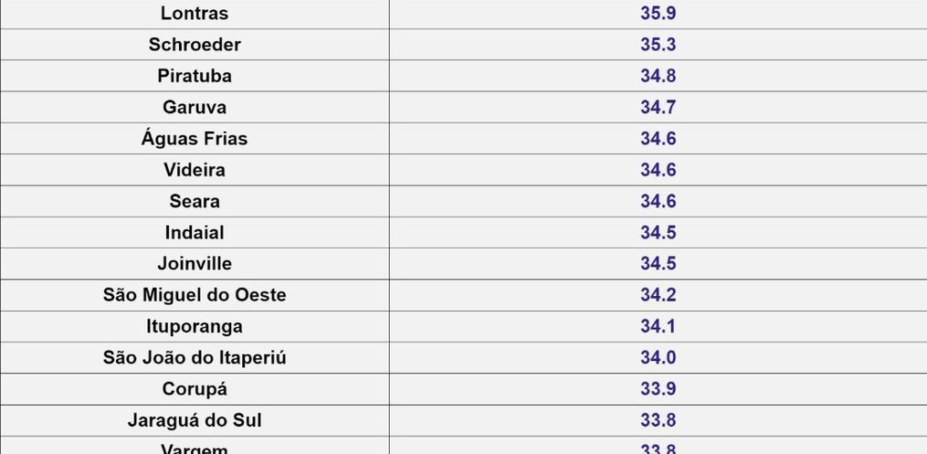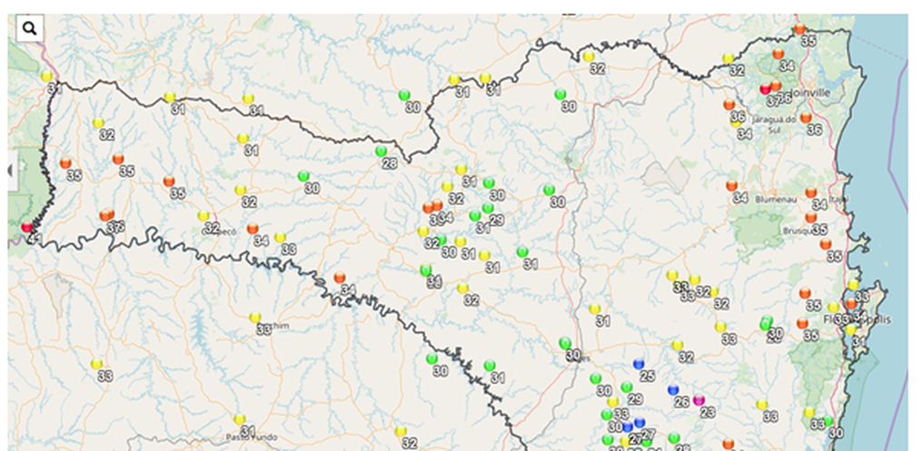 No dia 02 de fevereiro, Itapiranga já liderava a maior temperatura com 40,7ºC. Em 03 de fevereiro, a temperatura chegou em 41,4°C no município. Nesta segunda-feira, 05, a Defesa Civil do estado publicou as maiores temperaturas registradas no dia. Itapiranga continua no topo, e desta vez com a temperatura de 43ºC. Logo em seguida aparece Caibi com 36,3ºC. São Miguel do Oeste aparece na 13ª posição, com 34,2ºC.