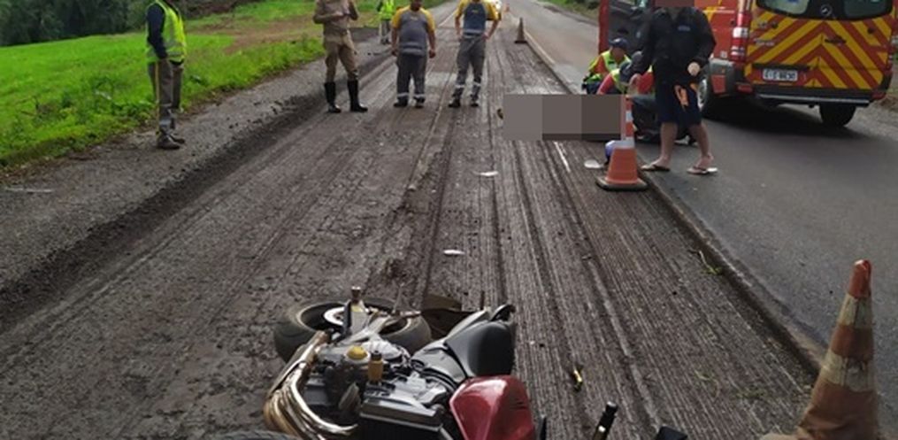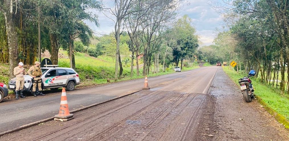 O local está em obras com o trabalho de recomposição da rodovia SC 163 e apresenta desnível no trecho.