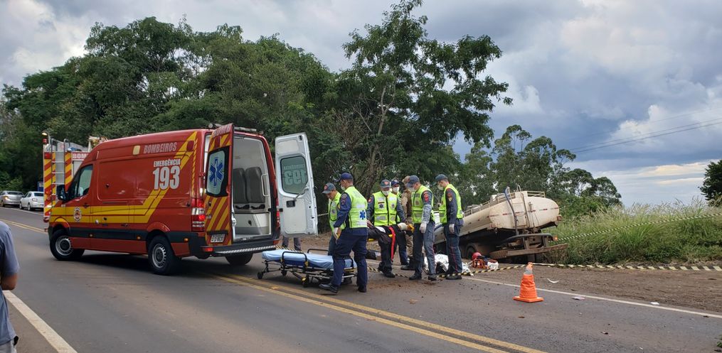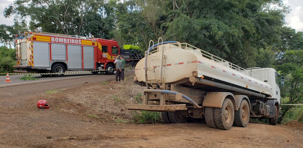 Em determinado momento, o caminhão sinalizou e foi para o acostamento. Depois, o motorista iniciou a conversão a esquerda para cruzar a pista. Ele relatou que não avistou a motocicleta, ocorrendo a colisão.