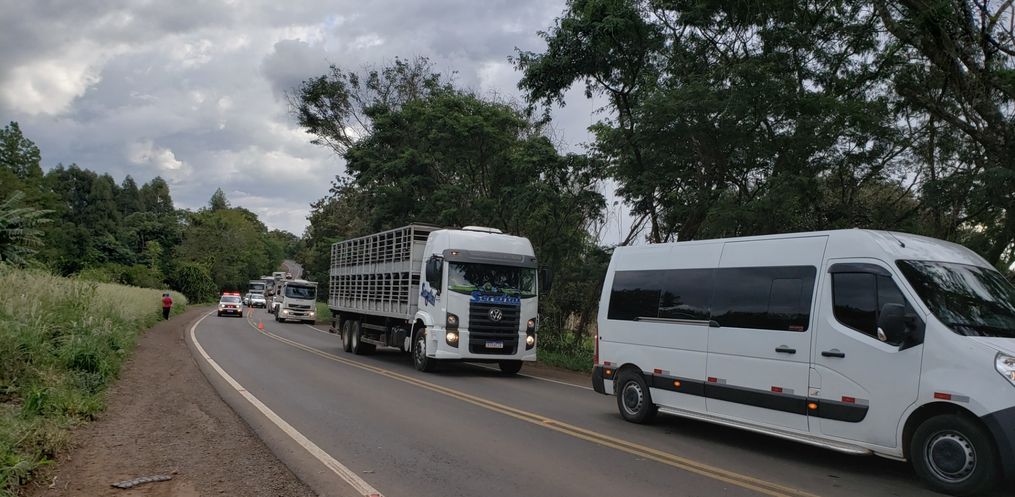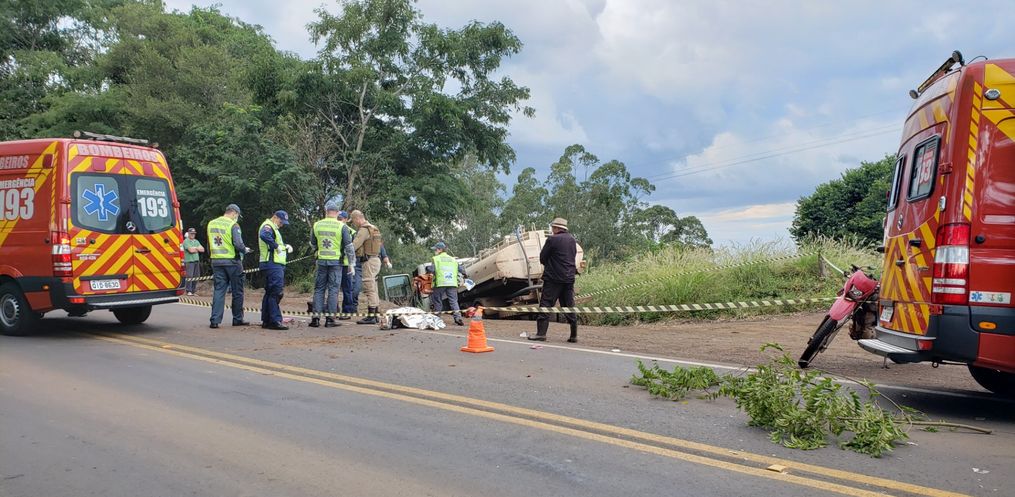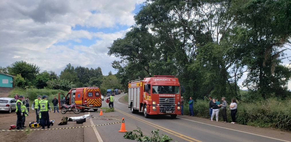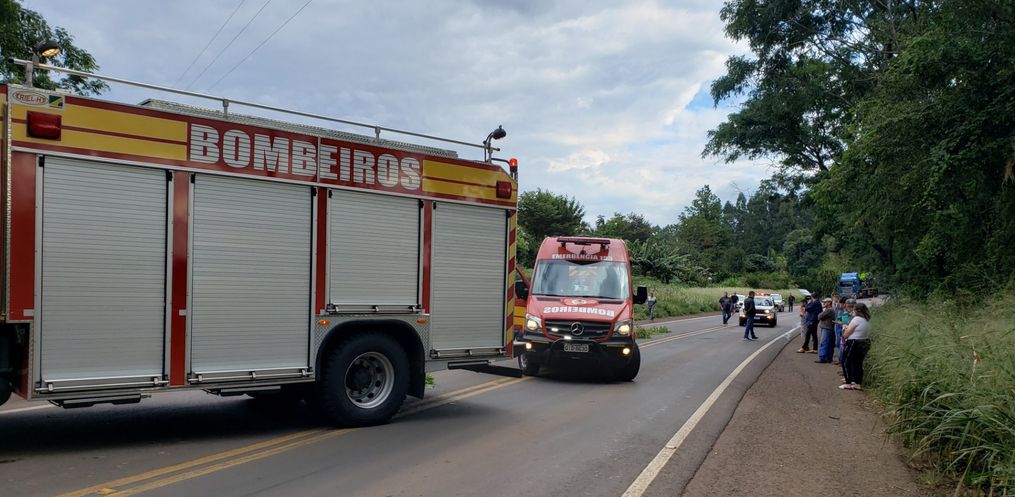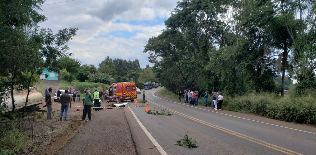 O acidente foi por volta das 15 horas e envolveu um caminhão Scania 420 e uma motocicleta Honda Bros, com placa de Itapiranga. Ambos faziam o sentido Iporã do Oeste a Itapiranga.