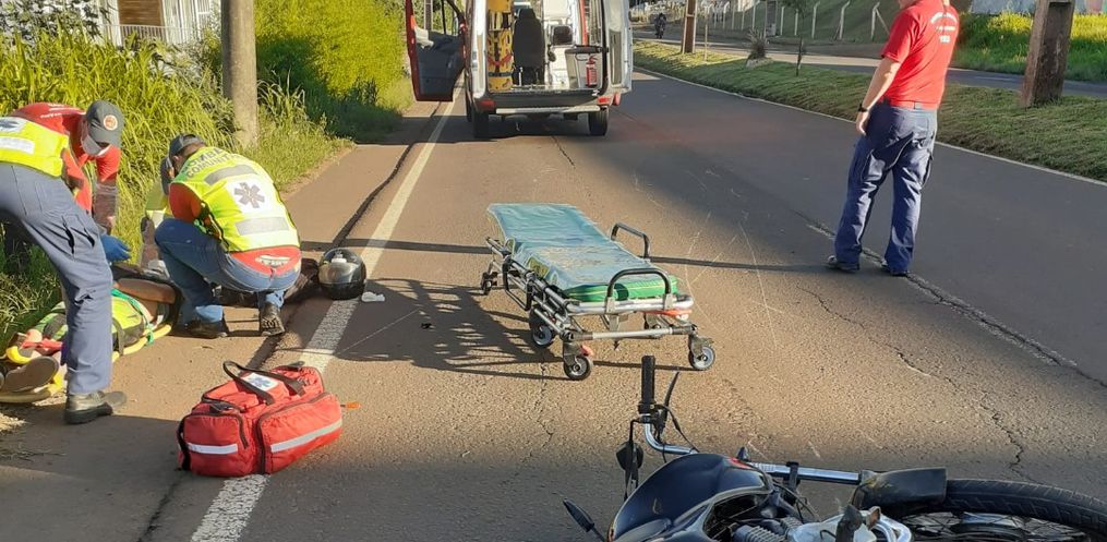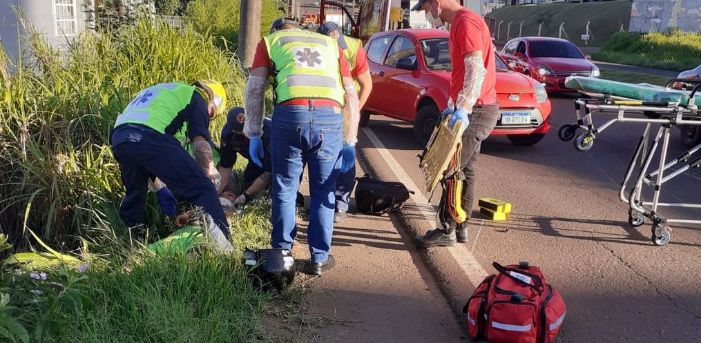 O rapaz que estava na moto, sofreu ferimentos leves e foi conduzido pelos bombeiros até o Hospital Regional. Imagens de videomonitoramento flagraram o momento da colisão.