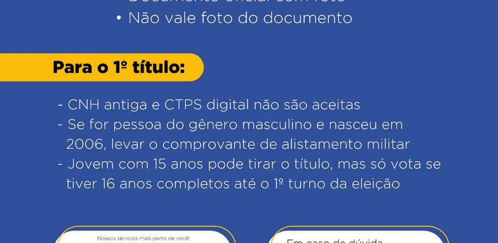 Os moradores de Paraíso terão dois dias para colocar o título de eleitor em dia sem precisar sair da cidade. A Justiça Eleitoral estará no município nos dias 19 e 20 de agosto de 2025, das 13h às 17h, no Salão de Múltiplo Uso, oferecendo serviços como emissão do primeiro título, cadastro biométrico, transferência de domicílio eleitoral e revisão cadastral.