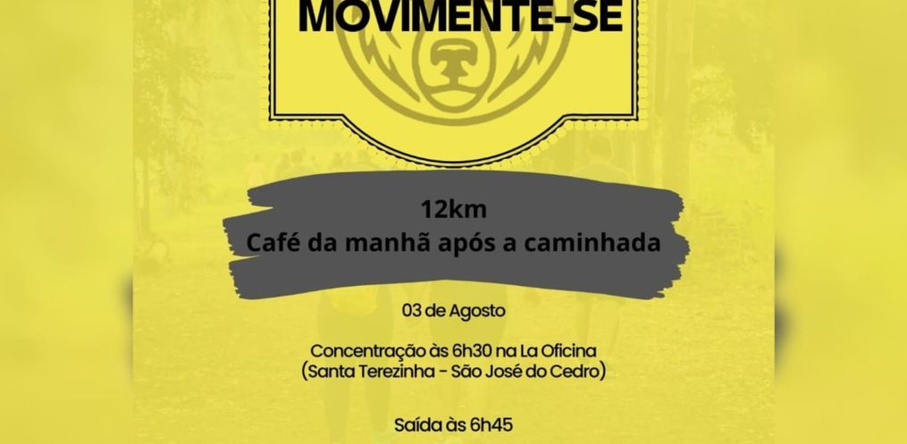 Mariani Martini, responsável pela segunda edição da caminhada Movimente-se da Lá Oficina, informa que o evento será realizado no dia 3 de agosto, em Santa Terezinha, São José do Cedro. A inscrição tem o valor de R$ 40,00, com 25% da arrecadação destinada à instituição Cedro Animal.
