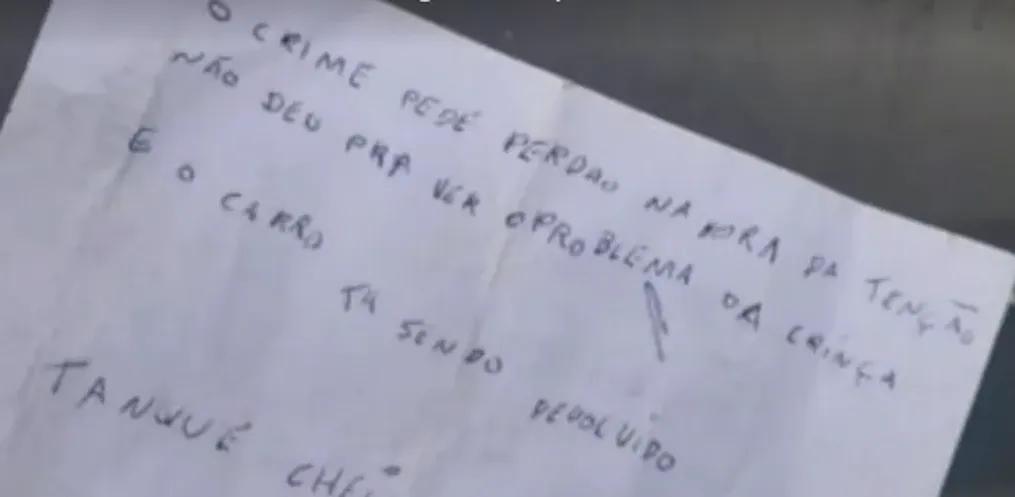 O carro foi encontrado na segunda-feira (30) por uma amiga da família, que viu o carro na rua e informou a polícia. Ao verificarem o veículo, os oficiais encontraram um bilhete deixado pelo assaltante para a mãe da criança, com um pedido de desculpas e dizendo que o tanque do veículo estava cheio de combustível.