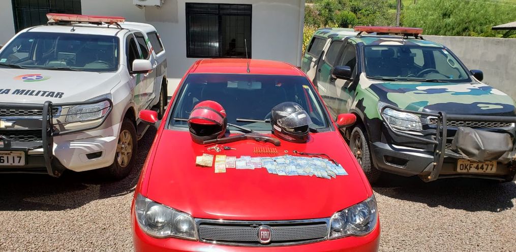 No veículo estavam dois homens, sendo apreendido com eles também uma espingarda calibre 28, cano cerrado, 10 munições e dinheiro. A arma apreendida também era objeto de furto. A motocicleta utilizada no crime foi localizada e apreendida no interior de Descanso.