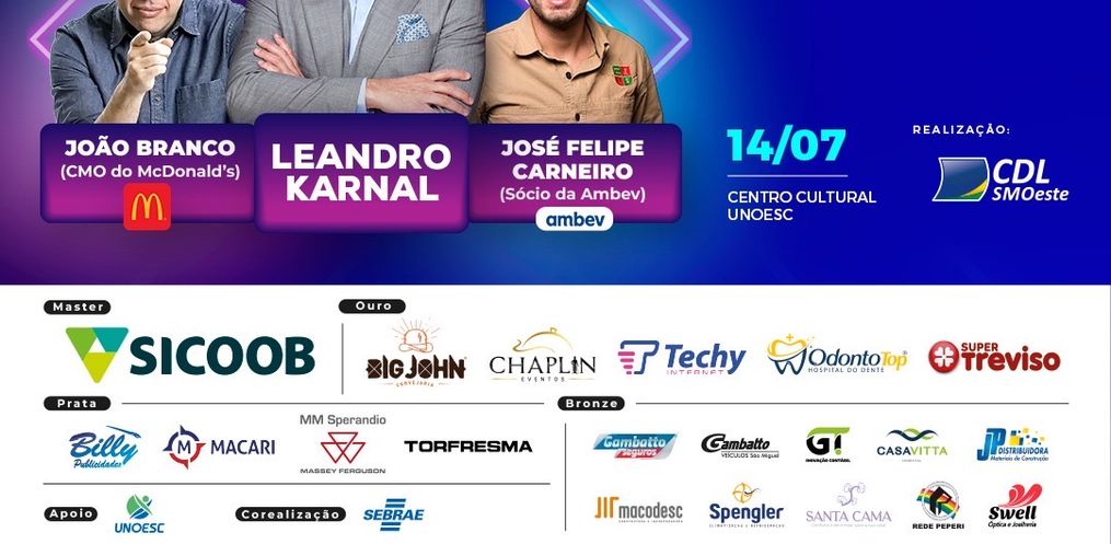 O evento que marcará São Miguel do Oeste como palco de grandes eventos empresariais trará nomes de referencia nacional e internacional no dia 14 de julho, no Centro Cultural da Unoesc. Dentre eles, Leandro Karnal, João Branco, do McDonald’s e José Felipe Carneiro, sócio da Ambev. Além disso a programação anunciada contemplará cases locais e um espaço de business place onde os participantes poderão desfrutar dos coffee breaks e fazer networking, durante as 8 horas de imersão.