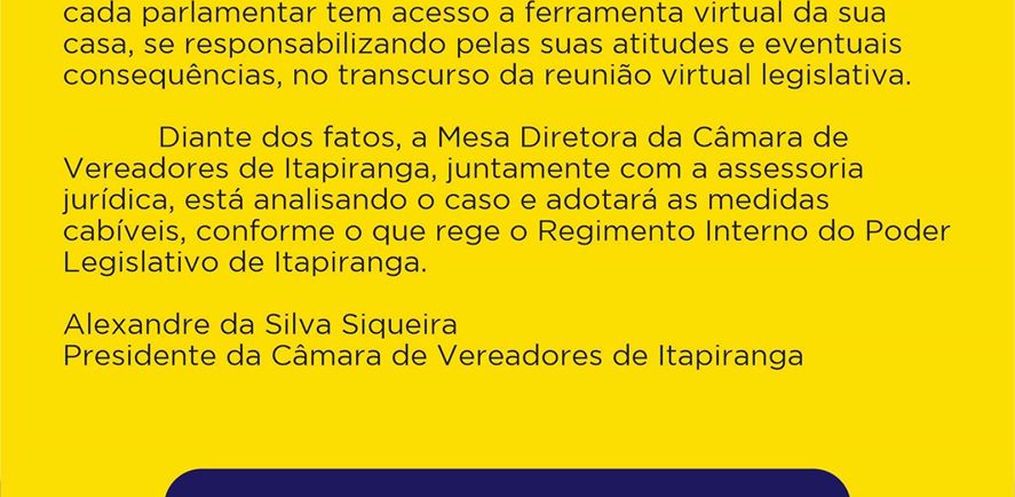 Em decorrência das imagens divulgadas nas redes sociais, afirmando que eu estaria ingerindo bebida alcoólica durante a sessão virtual realizada na noite desta segunda-feira, 15, venho a público esclarecer: