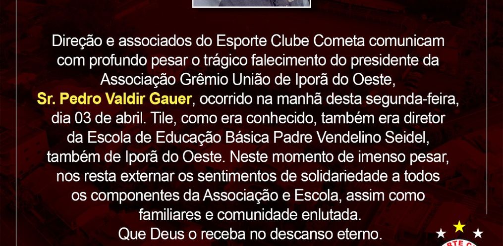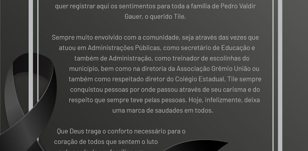 "Com muito pesar, que a Associação Grêmio União comunica o falecimento de nosso presidente, Pedro Valdir Gauer (Tile) hoje pela manhã ocorrido. Pessoa ímpar na sociedade e líder da nossa família Grêmio União, lutou muito para realizar o sonho de um dia ver a arquibancada no Laura Rauber, e conseguiu. Vai com Deus presidente, sua missão foi cumprida!"