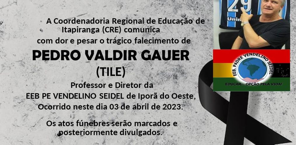 "É com profunda tristeza que informamos a perda irreparável do nosso diretor da Escola Professor Pedro Valdir Gauer (Tile). Nossa escola, nossa Família Padre Vendelino está de luto. Portanto, passo a passo, momento a momento vamos assimilando a não presença física do mesmo e por isso dispensamos as aulas de hoje... A tarde, noite passaremos mais detalhes da organização do dia de amanhã. Muita força/luz/esperança à todos! Pedro Valdir Sempre Presente!"