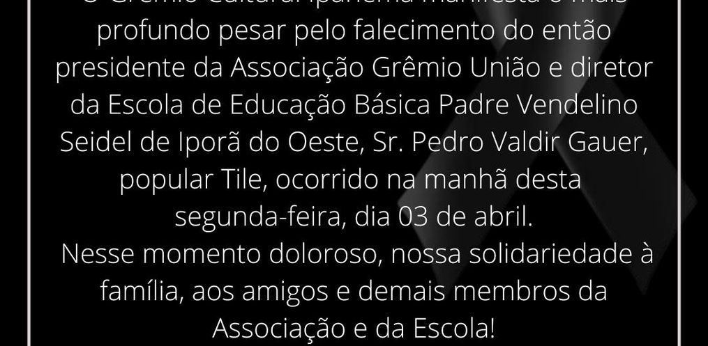 "É com profundo pesar que comunicamos o falecimento de Pedro Valdir Gauer, esposo da empresária e ex-colaboradora da entidade, Sirlei Schneider Gauer. Ao seu grandioso legado na educação, ao seu exemplo de disposição, determinação e alegria na vida em comunidade, nosso agradecimento em nome de Iporã do Oeste. Aos familiares, nossas condolências".